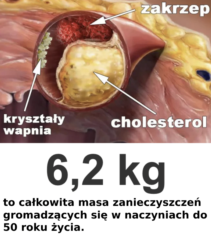 W wieku 50 lat w naczyniach gromadzi się około 5 kg płytek cholesterolowych. Złogi cholesterolu zwężają światło naczynia 4-5 razy.